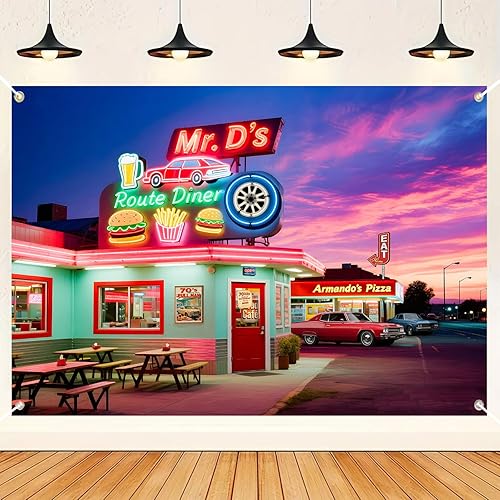 HANYING 50s Retro Dinner Backdrop Route 66 Night Cityscape Fast Food Store Photography Background Nostalgia Classic Car Vintage Party Decor Photo Background Neon Shooting Studio Props 7x5ft YL02WH