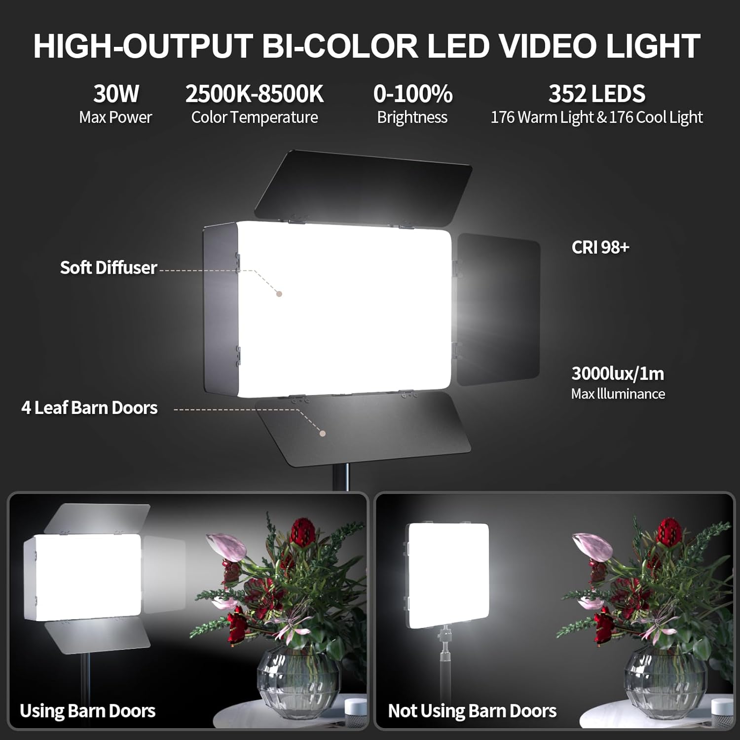30W Bi-Color LED Video Light with Barndoor - 2 Pack