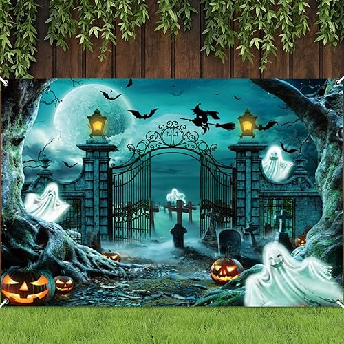 New Update: The happy halloween banner photography background photo booth gift for halloween birthday decorations photo backdrop for indoor outdoor party wall decor tapestry scary spooky decorations ghost pumpkin lantern castle Haunted Graveyard Night Moon fabric backdrop has 4 grommets on 4 corners of the fabric backdrops, and 6 strings, so that you can easily hang it on the backdrop stand.And you don't need to use binder clips or velcro to mount it.
