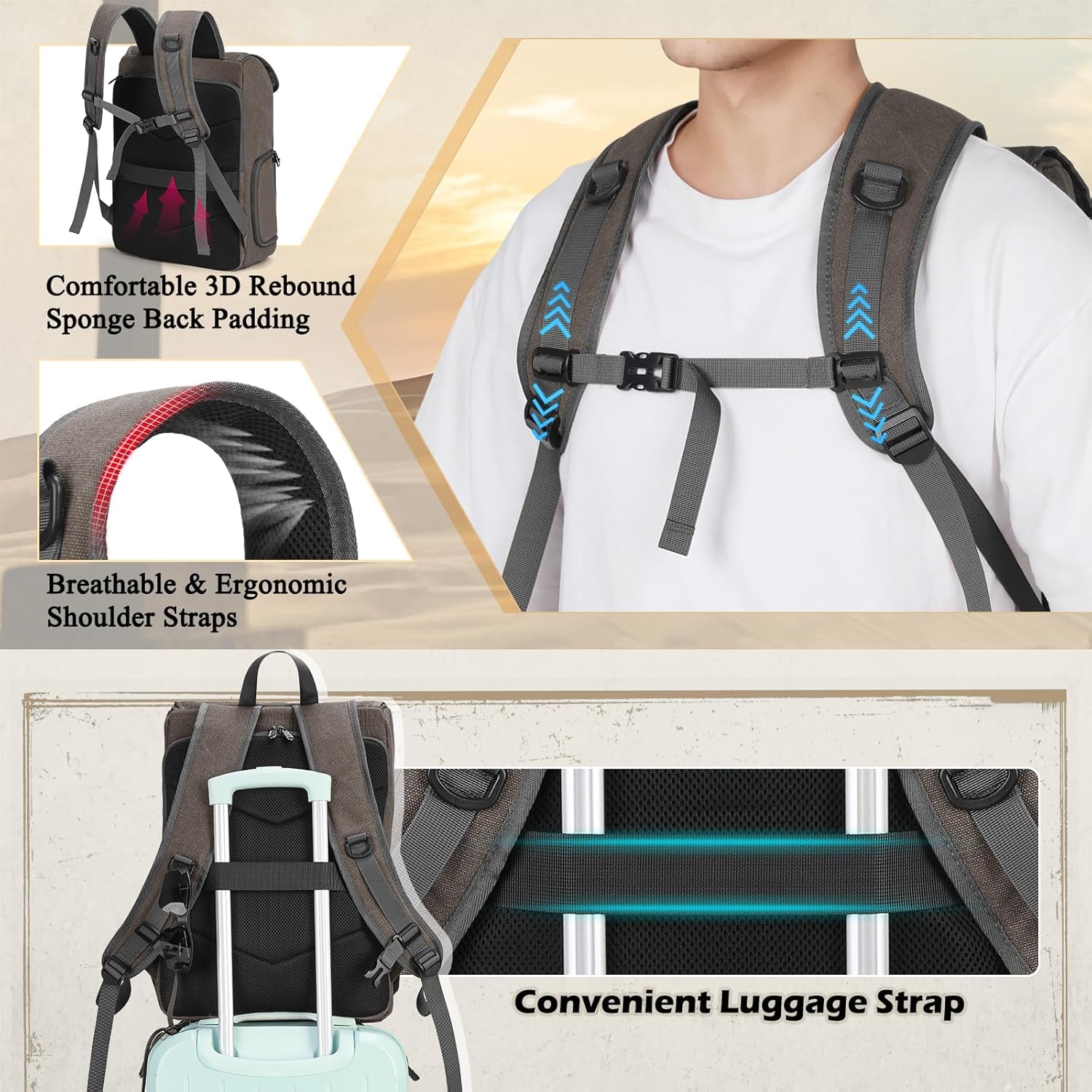 SUPERIOR CAMERA PROTECTION: Made from water-resistant and scratch-resistant canvas, equipped with a waterproof rain cover, this waterproof camera backpack provides dual protection for your precious photography accessories from any unexpected weather. Soft velvet lining and 360°padded cushioning of the photography backpack ensure shock absorption and safeguard cameras, lenses, flash from impacts, scratches, and other potential damages.