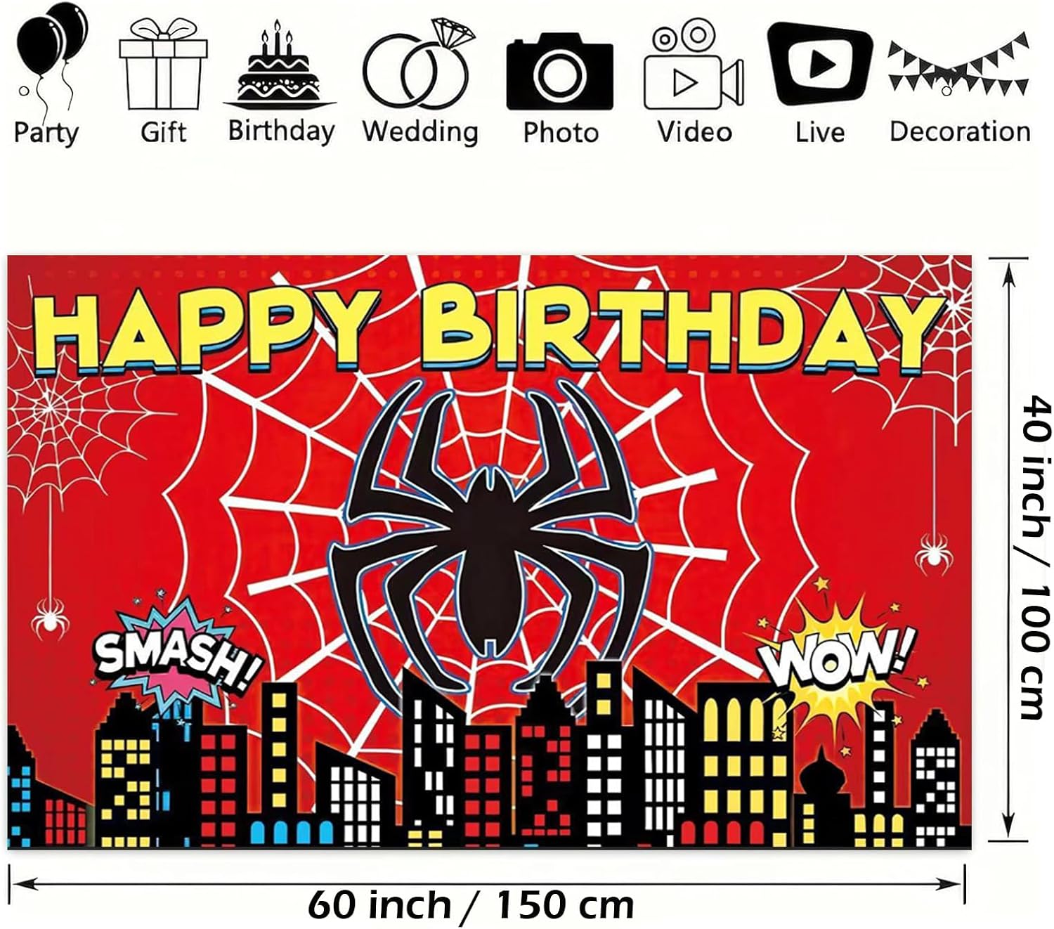 Happy Birthday Themed Background:The spider background feature in red as main color and design with super heroes pattern, our heroes photo prop will be an eye-catching item in your birthday party.
